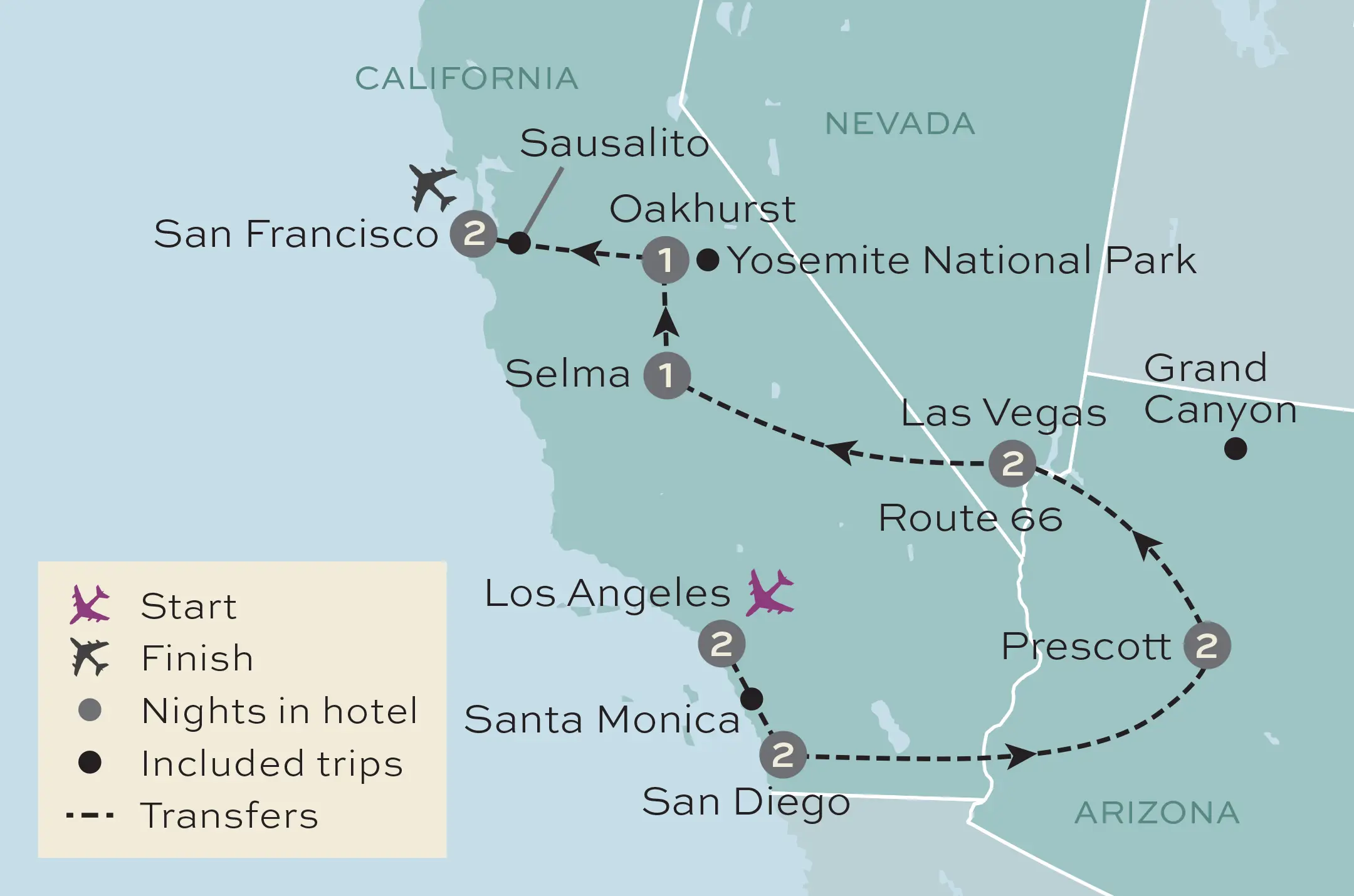 Experience incredible natural and man-made wonders on this epic tour. Starting in Los Angeles, you'll see highlights including the TCL Chinese Theatre and have the chance to visit Warner Bros Studios. Enjoy a stay in San Diego, a city perched on the edge of the Pacific Ocean, then take a journey through the Arizona Desert. A visit to the Grand Canyon is an amazing trip of a lifetime, and an optional flight over comes highly recommended. You'll travel along a section of Route 66 to the neon-lit wonderland of Las Vegas before heading back to California through the Mojave Desert. The highlights keep on coming as you explore Yosemite National Park, then cross San Francisco's famous Golden Gate Bridge for a two-night stay in this cosmopolitan city.