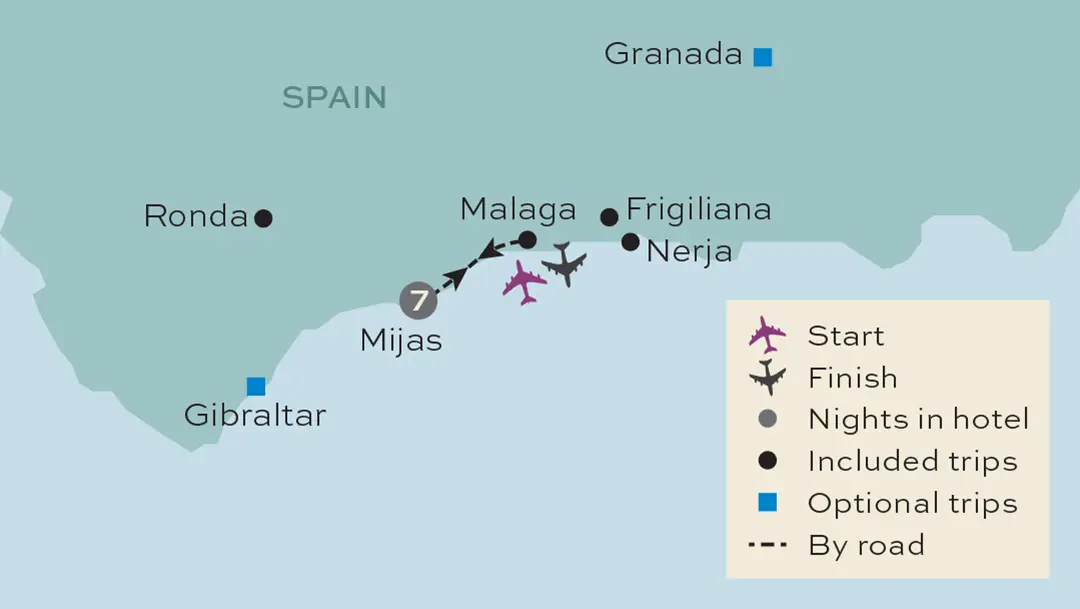 • 14 meals: 7 breakfasts, a welcome drink, 7 dinners including a festive Christmas Day dinner with wine and a farewell dinner in the village of Mijas