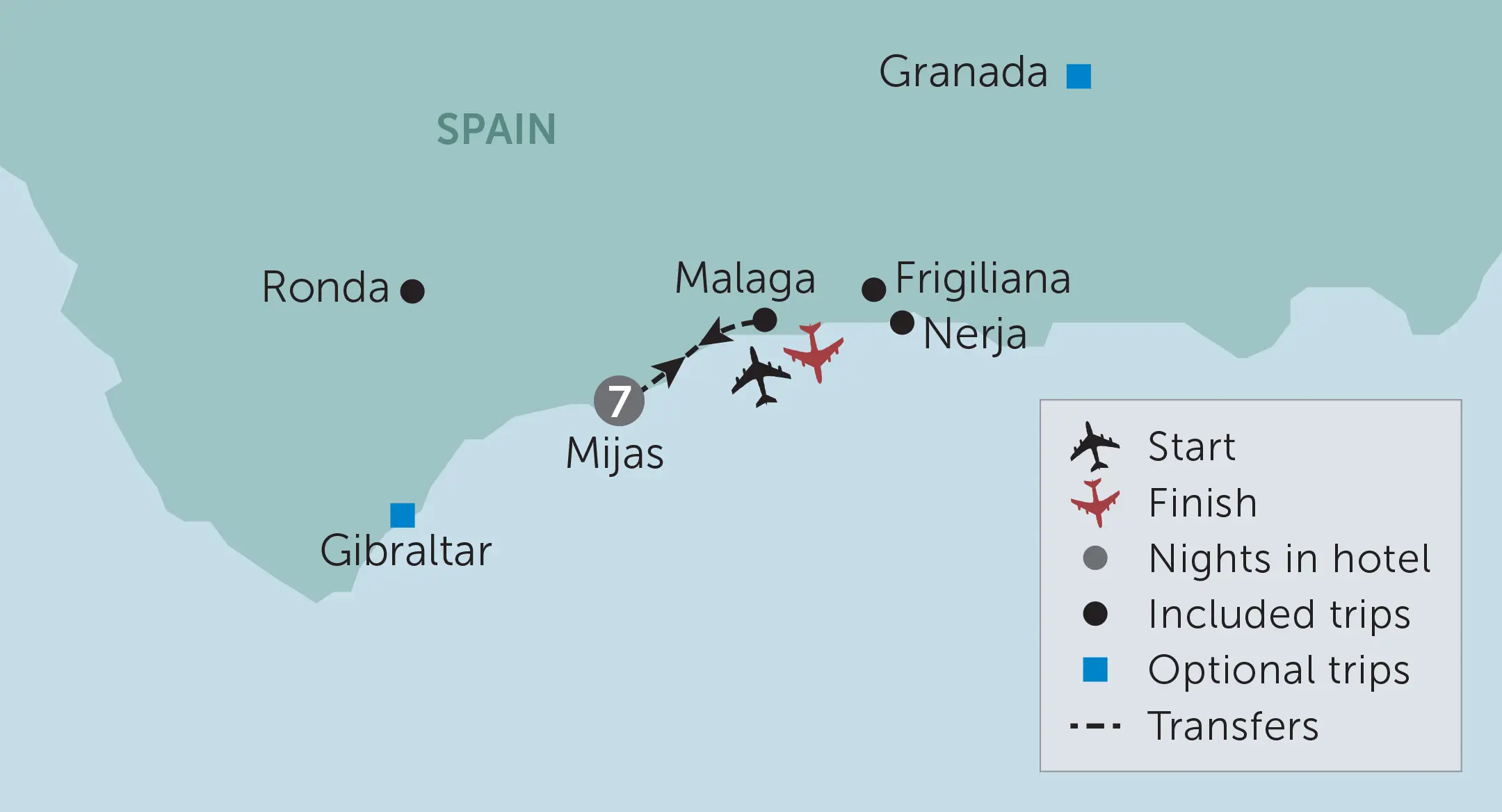• 14 meals: 7 breakfasts, a welcome drink, 7 dinners including a festive Christmas Day dinner with wine and a farewell dinner in the village of Mijas