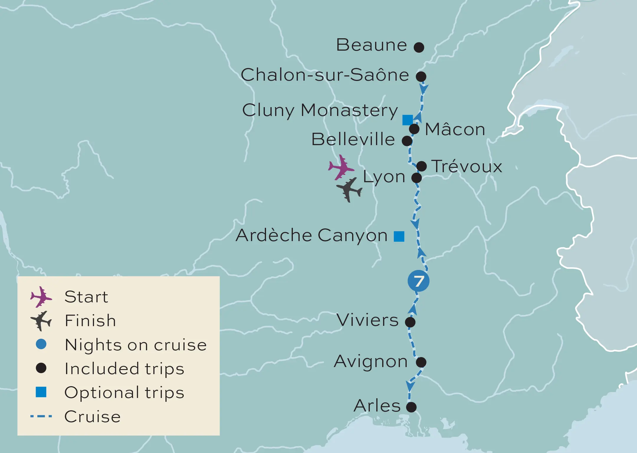 From Lyon this cruise heads north on the Saône then on to the Rhône towards the Mediterranean sea. Exploring the colourful countryside of the South of France and the beauty of its historical cities, including the famous Ardèche Gorge. Continue into Provence and the Camargue where the incomparable atmosphere inspired Van Gogh. Visit Burgundy, learn why the Romans felt so at home in Mâcon and Arles and explore Avignon with its great buildings including the papal palace.