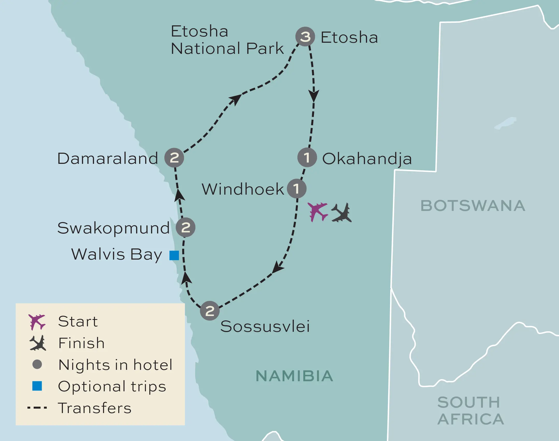 Today we’ll board our 4x4 safari vehicles for a full-day game drive in the park, before arriving to our lodge this evening. The heart Etosha National park, which was founded as early as 1907, is the 5,000 square kilometre salt pan. This salt pan, which is up to 120 km long and 55 km wide, was formed about 2 - 10 million years ago when the Kunene River flowed into Lake Ekuma, the extension of which formed the Etosha Pan. Later, the Kunene shifted its bed westwards to the Ruacana Falls, cutting off the water supply to the lake. During the drying period, the bottom of the former inland lake became very brackish, wind erosion deepened the depression and a deposited layer of clay and silt remained, up to 240m thick in places.
