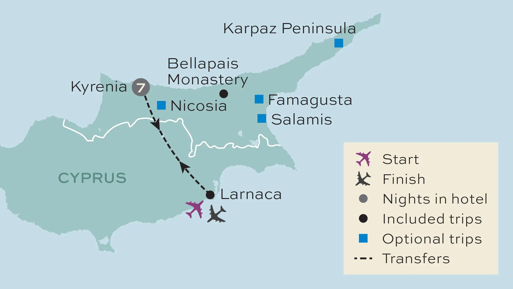 Today, you fly to Larnaca today. On arrival we will transfer you to your hotel in the ancient town of Kyrenia.