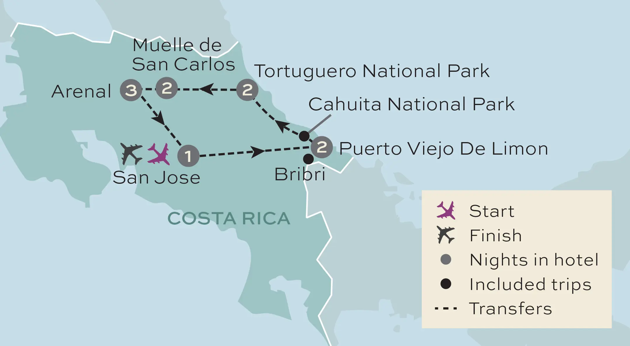 We've lined up a fantastic optional excursion for today. If you prefer to admire the rainforest from a higher vantage point, a visit to the Hanging Bridges of Arenal is a must. Explore the rainforest on a walking trail which crosses no less than 15 bridges, six of which are hanging in the rainforest canopy, offering a spectacular view of the scenery below. It’s an incredible experience, with highlights including 98-metre-long Tyra Bridge and Waterfall Bridge which is suspended 60 metres in the air. Keep your eyes peeled as you walk - more than 250 species of bird live in this rainforest reserve along with a vast array of reptiles, mammals and insects. In the early evening, pack your swimwear for a visit to a thermal bath complex in the jungle. Afterwards, enjoy a dinner.